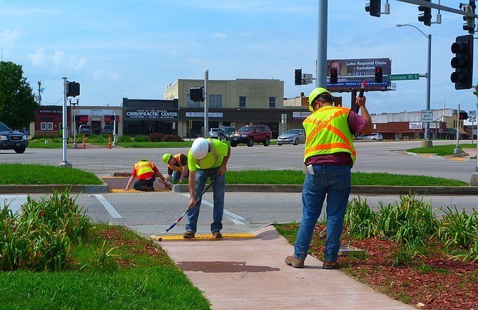 ADA Compliance: Construction crews install detectable warnings within curb ramps. Detectable warnings assist the visually impaired in identifying when a pedestrian walkway is about to encounter a hazardous condition (such as a street/traffic crossing).