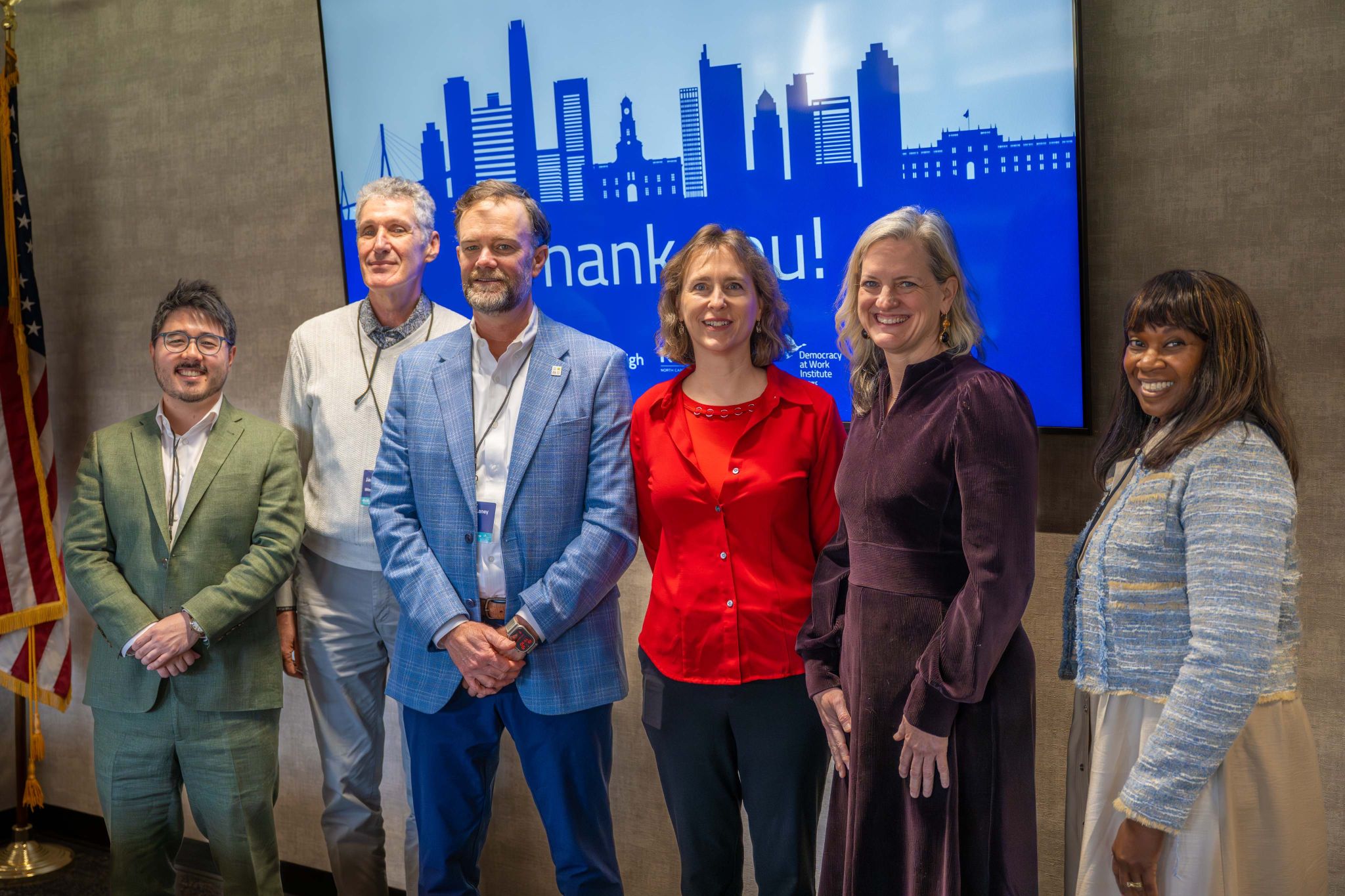 Speakers pictured left to right: Zen Trenholm (Democracy at Work Institute), James Watts (Weaver Street Market), Stewart Laney (S&ME), Illa Burbank (North Carolina Employee Ownership Center), Raleigh Mayor Janet Cowell, and Dr. Darlene Deberry (NCGrowth – UNC Chapel Hill)