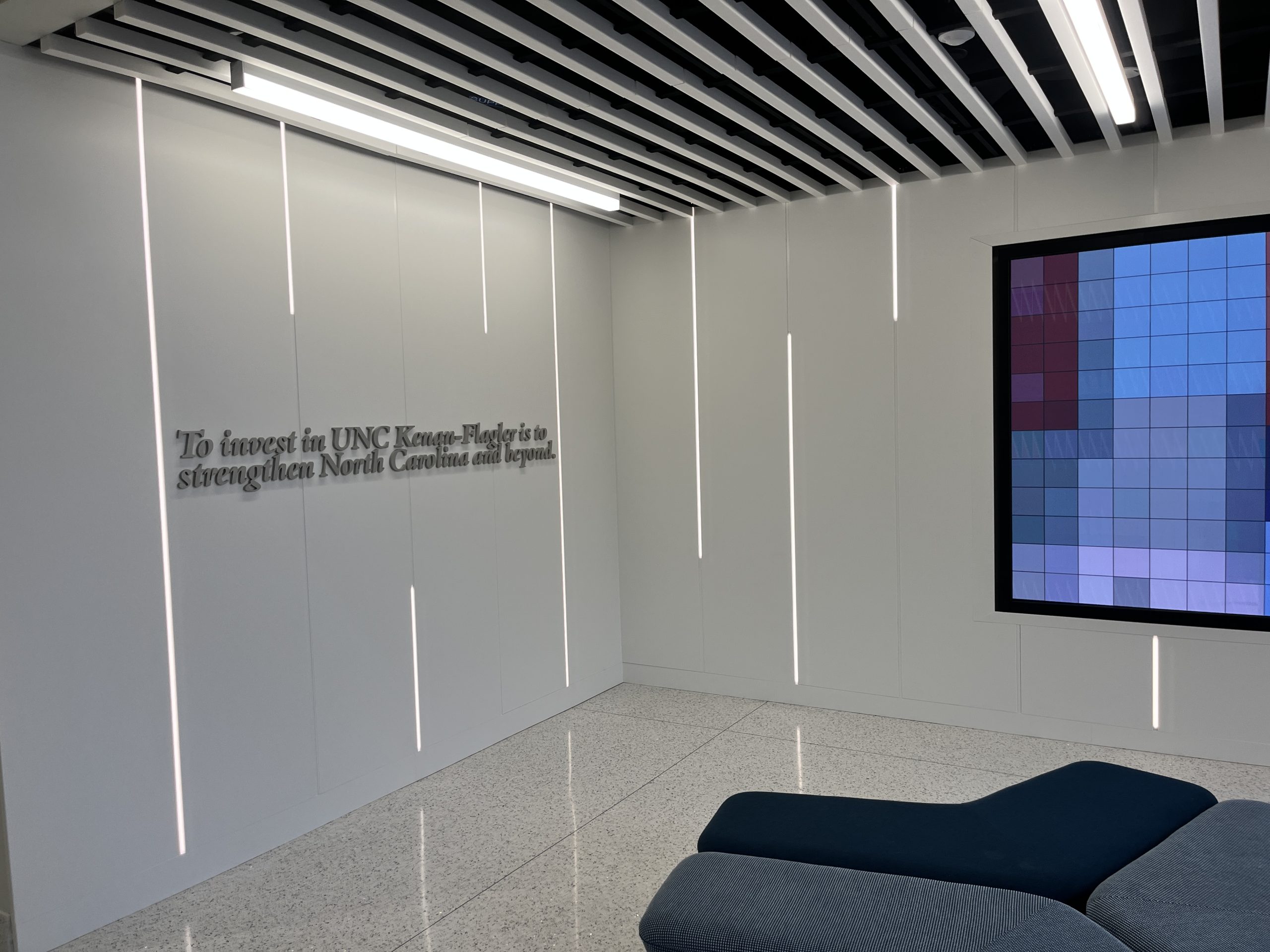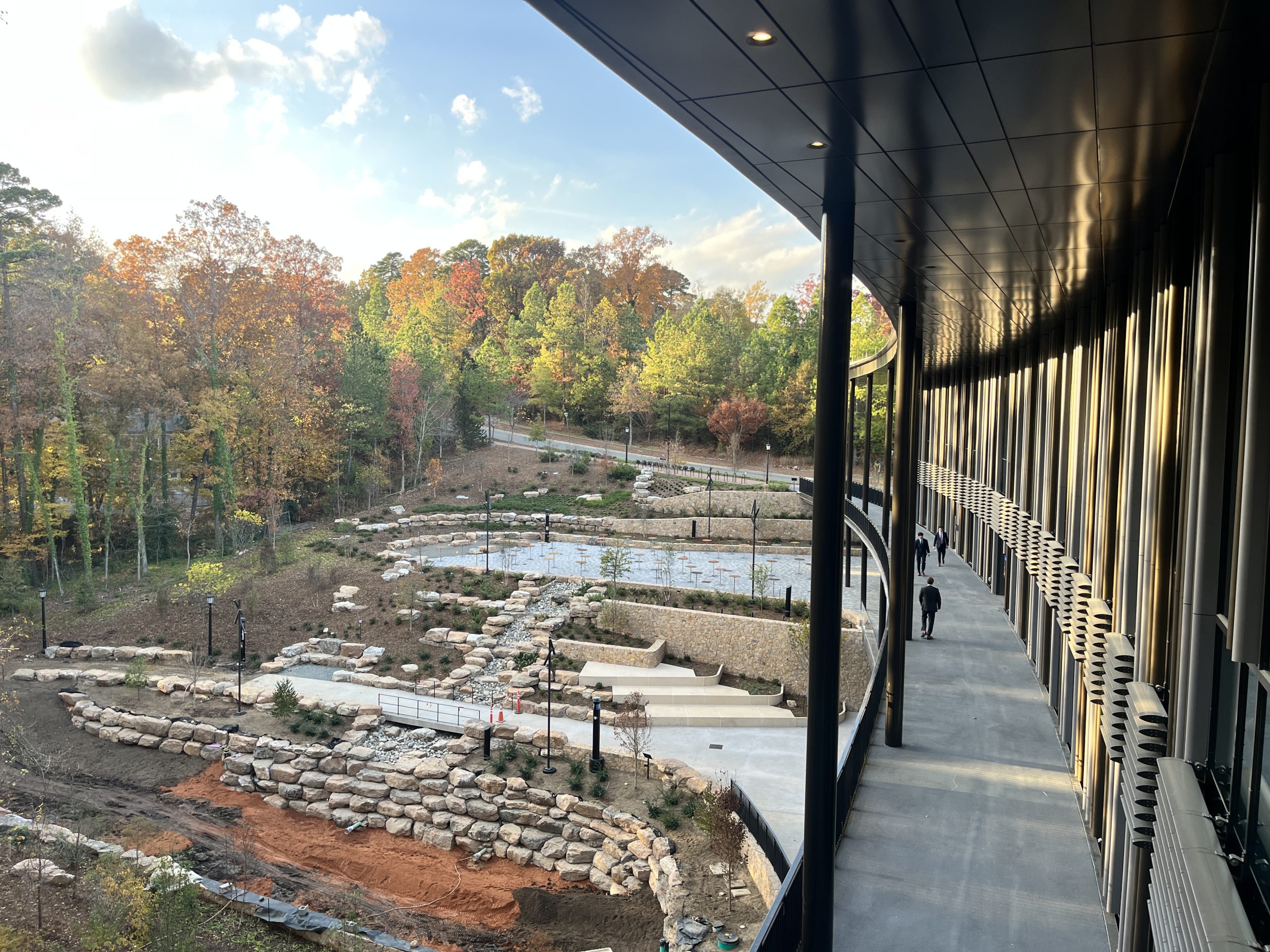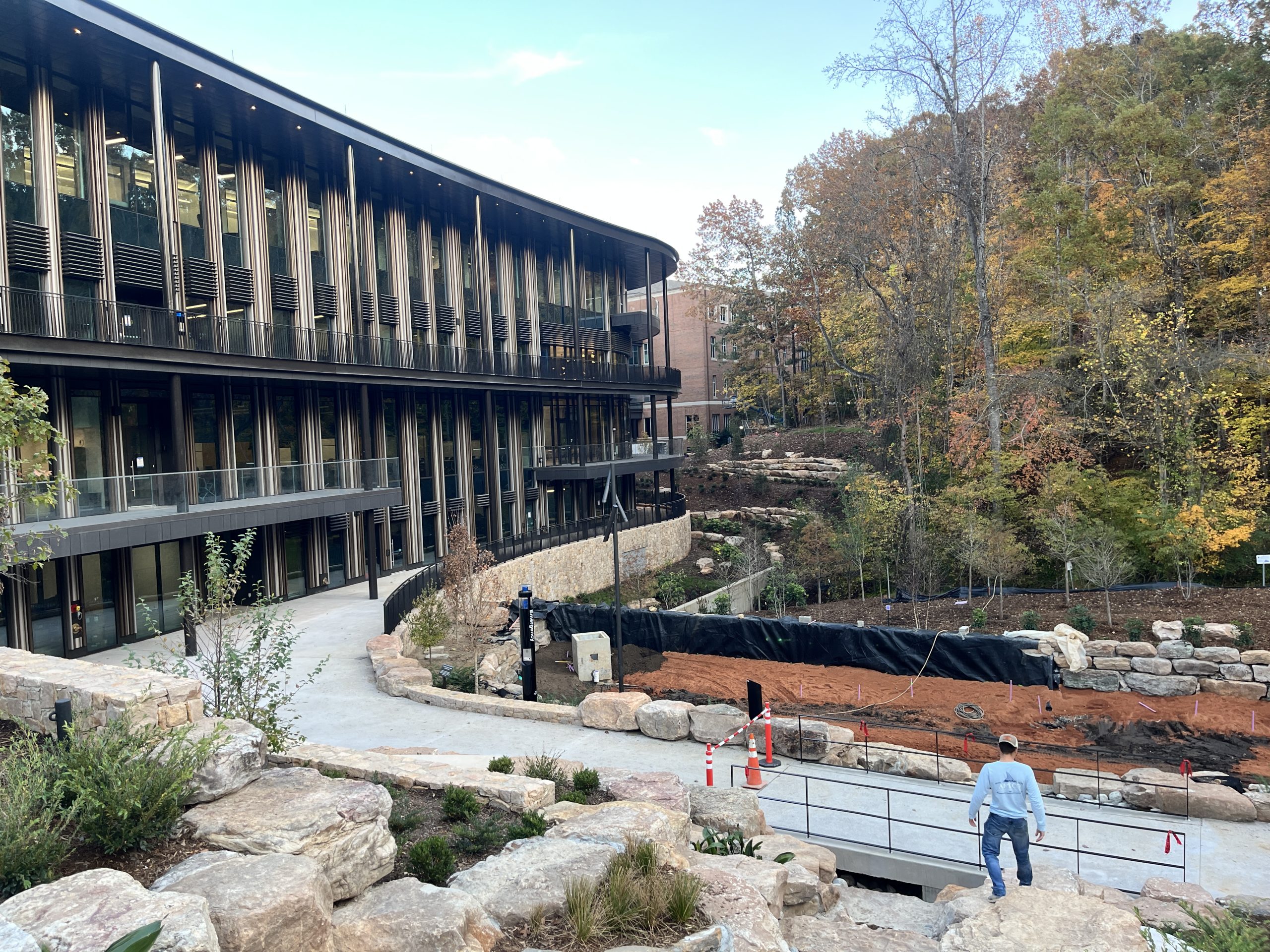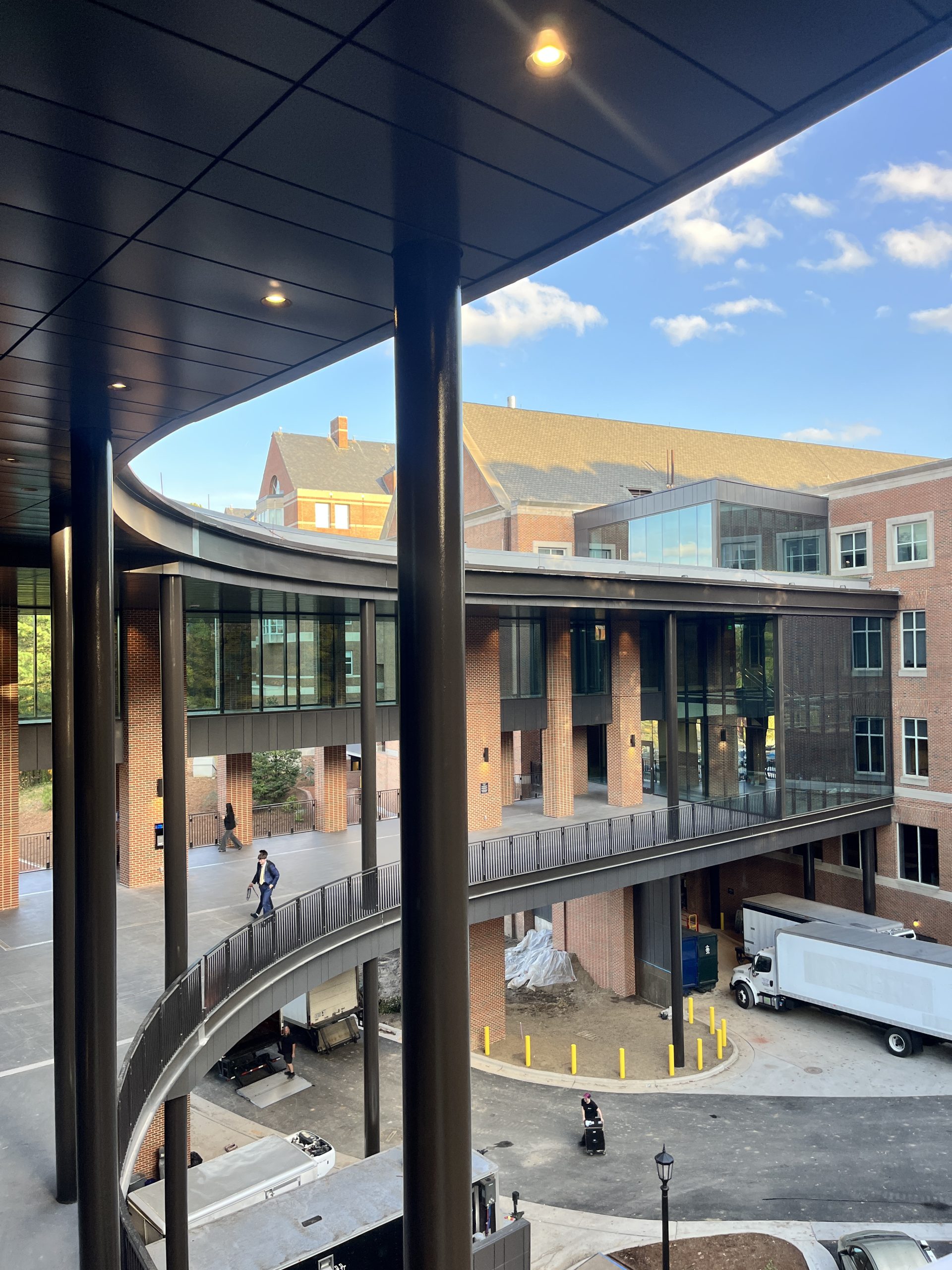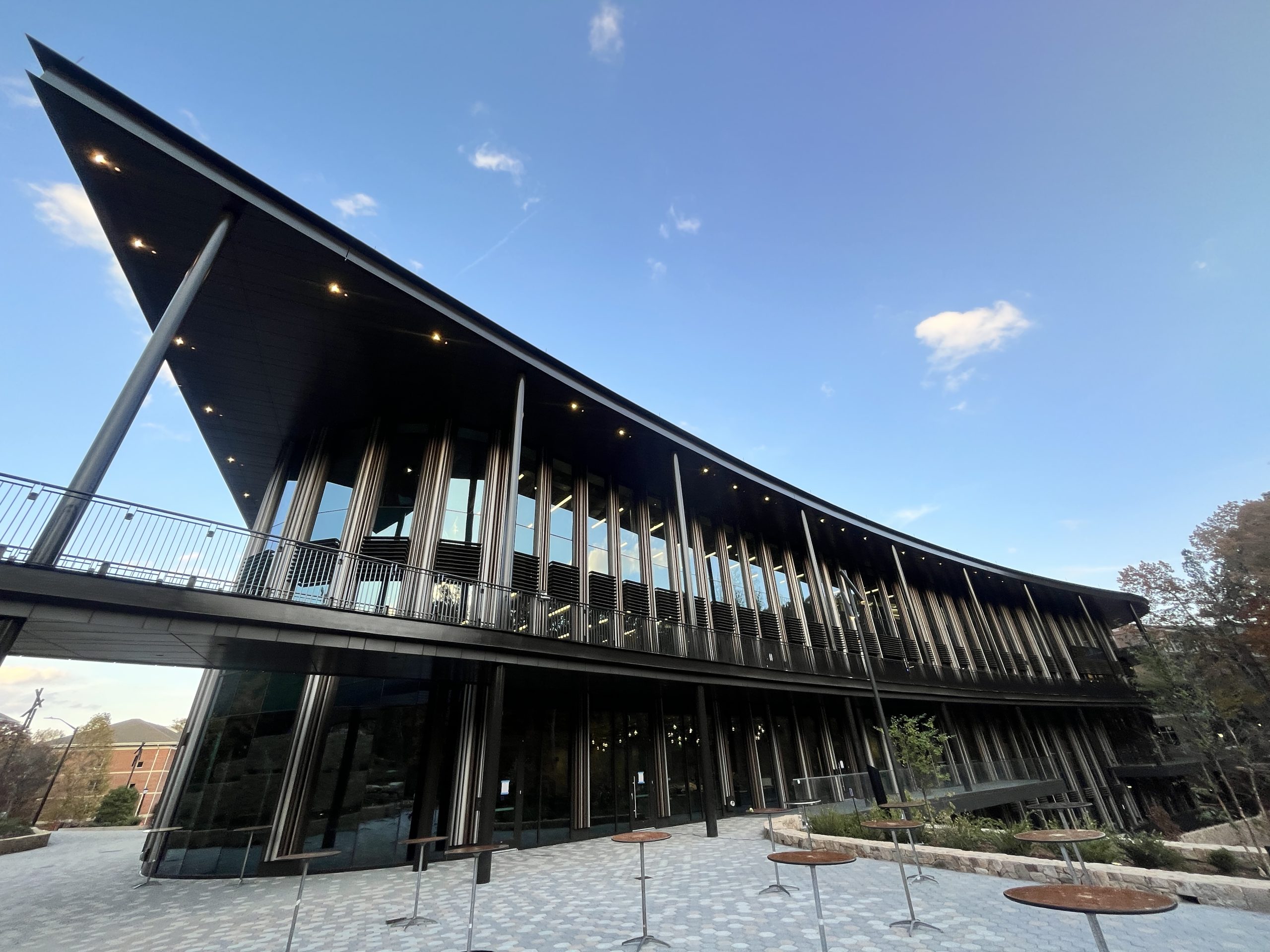 The project encompasses approximately 393,902 square feet of total programmed space, including a major new building addition and an existing parking deck. The 146,206-square-foot addition, located north of the McColl Building across Kenan Drive, establishes a new primary entrance to the business school along Blythe Drive. Site improvements enhance campus connectivity and pedestrian flow, featuring an exterior walkway along the west façade that links directly to a new pedestrian bridge. Cascading landscaped terraces and accessible decks further create a seamless north–south pedestrian experience across the site.
