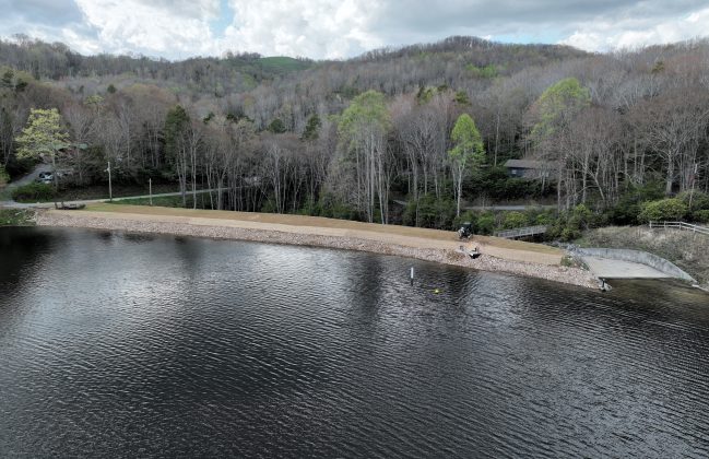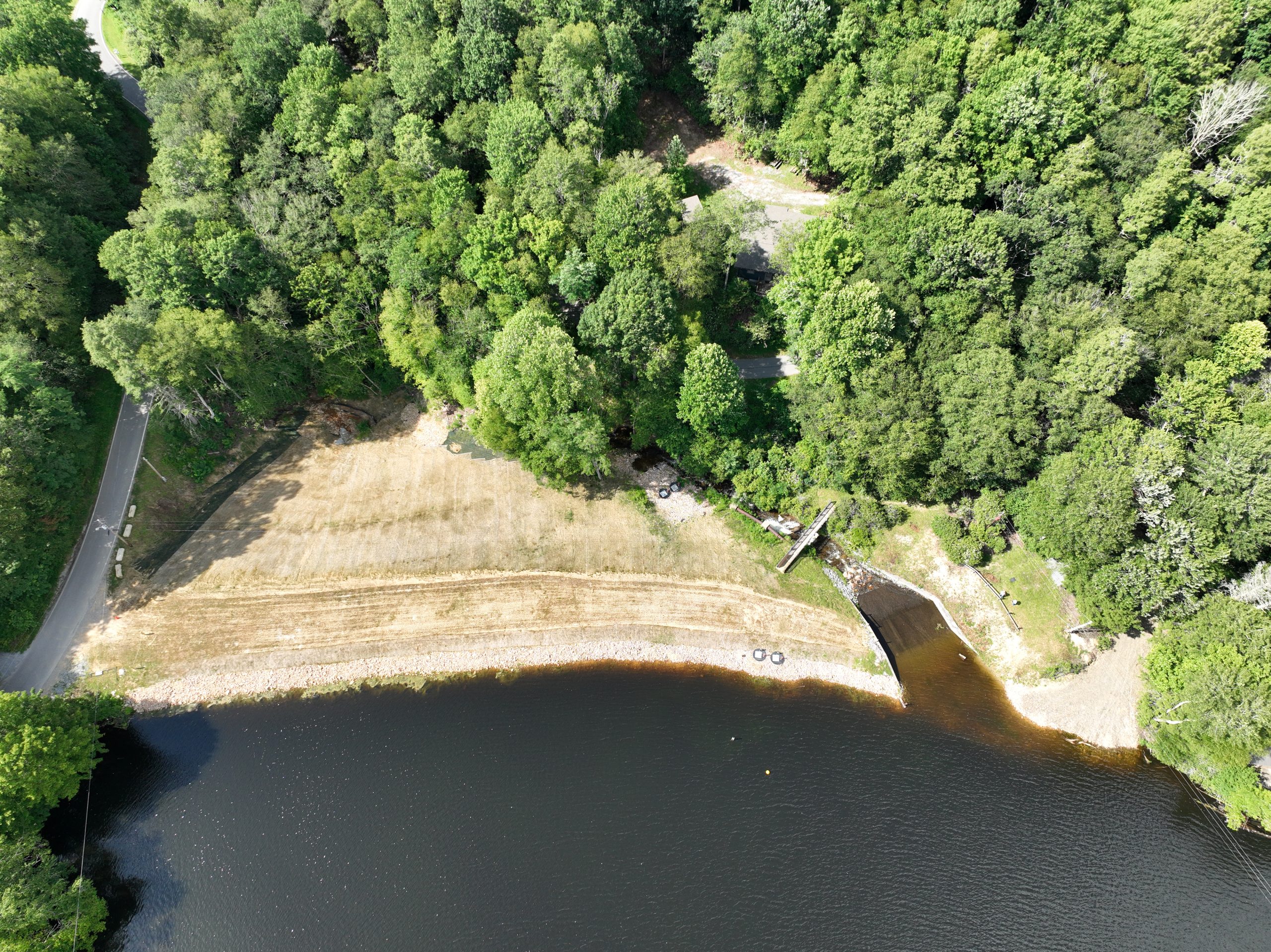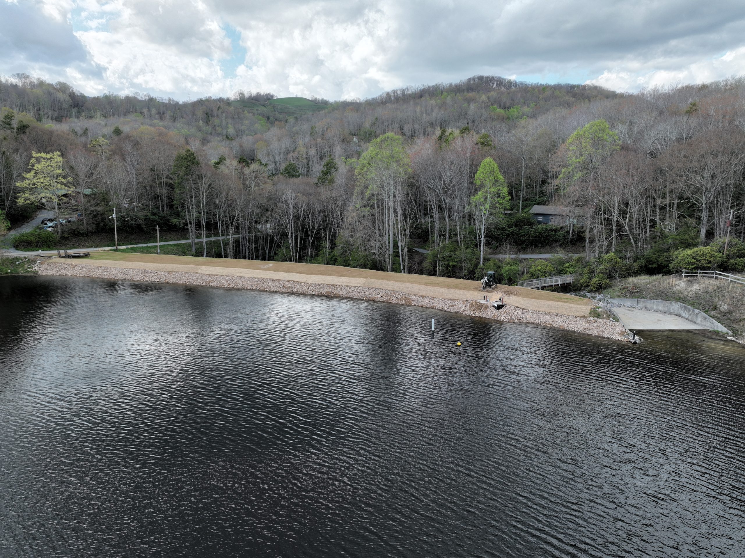 S&ME was hired to evaluate the existing lake drain for Ripshin Lake Dam and prepare an Emergency Action Plan (EAP). The dam consists of an approximately 43 feet tall by 395 feet long earthen dam impounding a 56-acre lake. The dam consists of a Small, High Hazard Dam due to location above nearby residences, Highway 19, and the Town of Roan Mountain. The dam was completed in the 1940s with modifications performed around 1992 that included raising the dam and construction of a concrete chute spillway.